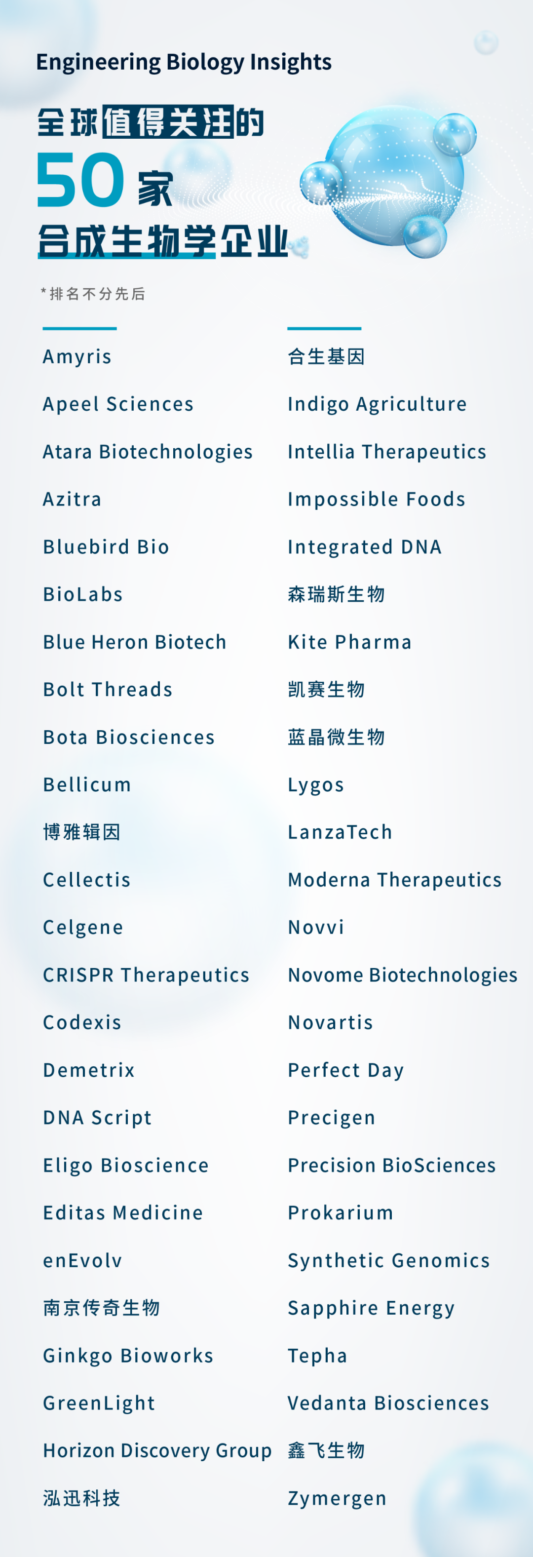 從 CB Insights 的統(tǒng)計(jì)數(shù)中不難發(fā)現(xiàn),從 2015 年開(kāi)始,大批合成生物學(xué)相關(guān)公司相繼成立。融資階段分布數(shù)據(jù)顯示,2015-2017 年,融資階段主要分為在種子 / 天使輪,3 年平均占比超 35%;而 2018 年至今,融資階段向 A 輪及 B 輪轉(zhuǎn)移,其中 2020 年 1-8 月,B 輪融資占比已達(dá) 33%。隨后,基于 EB Insights 的研究成果,劉炯在會(huì)上發(fā)布了 “全球最值得關(guān)注的 50 家合成生物學(xué)企業(yè)” 榜單,并重點(diǎn)介紹深耕中國(guó)本土市場(chǎng)的公司,在他們用 “上帝之手” 譜寫生命奧秘的背后,變革的巨浪早已奔涌而至。立足中國(guó),為了實(shí)現(xiàn)可持續(xù)性發(fā)展,合成生物學(xué)可以獲得能源、化學(xué)等方面的可持續(xù)產(chǎn)品,也能減少環(huán)境污染。而且更重要的是,合成生物學(xué)是一門新興學(xué)科,雖然目前中國(guó)的生物技術(shù)整體而言還趕不上發(fā)達(dá)國(guó)家,但是對(duì)于早期階段起步的合成生物學(xué),中國(guó)也許能成為這一具有極大潛力的研究領(lǐng)域的主要參與者。以下為榜單中的中國(guó)公司介紹,排名不分先后:關(guān)鍵詞:全球頂尖合成生物學(xué)產(chǎn)業(yè)團(tuán)隊(duì),構(gòu)建計(jì)算驅(qū)動(dòng)的生物鑄造廠上榜理由:Bota Biosciences 成立于美國(guó)劍橋,以計(jì)算為基礎(chǔ)搭建酶工程、菌株工程和發(fā)酵工藝工程平臺(tái),涵蓋酶催化、生物轉(zhuǎn)化和生物全合成三大技術(shù)路徑,通過(guò)由云端遠(yuǎn)程操控和自動(dòng)化設(shè)施組成的云端實(shí)驗(yàn)室,可實(shí)現(xiàn)每年 1,000,000+ 通量的菌株構(gòu)建實(shí)驗(yàn)操作、測(cè)試和數(shù)據(jù)收集,為化?、?品、農(nóng)業(yè)和制藥等行業(yè)提供創(chuàng)新產(chǎn)品研發(fā)與大規(guī)模生產(chǎn)解決方案。團(tuán)隊(duì)成員在合成生物學(xué)領(lǐng)域具有多個(gè)產(chǎn)品的成功工業(yè)化經(jīng)驗(yàn)。 關(guān)鍵詞:國(guó)內(nèi)首個(gè) CRISPR 基因編輯療法臨床試驗(yàn)申請(qǐng)?zhí)峤?/strong>上榜理由:基于獲獎(jiǎng)技術(shù) CRISPR 為多種遺傳疾病和癌癥加速藥物研究以及開(kāi)發(fā)創(chuàng)新療法 。今年,該公司宣布中國(guó)國(guó)家藥品監(jiān)督管理局藥品審評(píng)中心(CDE)已經(jīng)受理其針對(duì)輸血依賴型 β 地中海貧血的基因編輯療法產(chǎn)品 ET-01 的臨床試驗(yàn)申請(qǐng),這是國(guó)內(nèi)首個(gè) CRISPR 基因編輯療法臨床試驗(yàn)申請(qǐng)?zhí)峤?。ET-01 的通用名為 “CRISPR/Cas9 基因修飾 BCL11A 紅系增強(qiáng)子的自體 CD34+ 造血干祖細(xì)胞注射液”,通過(guò)對(duì)造血干細(xì)胞的合成改造,解決輸血依賴型 β 地中海貧血患者的患病痛苦。關(guān)鍵詞:全球首次利用合成生物學(xué)技術(shù)優(yōu)化、改造的免疫療法用于治療中晚期腫瘤病人上榜理由:中國(guó)首家致力于合成生物技術(shù)在生物醫(yī)藥領(lǐng)域應(yīng)用的高新技術(shù)公司,2020 年 11 月 27 日,基于國(guó)內(nèi)原創(chuàng)的合成生物技術(shù)開(kāi)發(fā)的首款基因治療產(chǎn)品 SynOV1.1 獲得美國(guó) FDA 臨床試驗(yàn)許可,用于治療包括中晚期肝癌在內(nèi)的甲胎蛋白(AFP)陽(yáng)性實(shí)體瘤,并計(jì)劃近期在美國(guó)紀(jì)念斯隆?凱特琳癌癥中心(Memorial Sloan Kettering Cancer Center)開(kāi)展 I/IIa 期臨床研究。這款藥物在中國(guó)的臨床試驗(yàn)申請(qǐng)亦正在進(jìn)行中。將全球第一次將經(jīng)過(guò)合成生物學(xué)技術(shù)優(yōu)化、改造的免疫療法用于治療中晚期腫瘤病人。關(guān)鍵詞:讓 DNA 技術(shù)和應(yīng)用更好地服務(wù)生活上榜理由:團(tuán)隊(duì)累計(jì)具有近 50 年的合成生物學(xué)行業(yè)經(jīng)驗(yàn)。目前公司開(kāi)發(fā)的技術(shù)平臺(tái)為全球領(lǐng)先的合成生物學(xué)完整的 DNA 合成組合平臺(tái) ——Syno®1.0,Syno®2.0 和 Syno®3.0,可以高效應(yīng)用于人源化抗體庫(kù)構(gòu)建、基因工程疫苗開(kāi)發(fā)、工業(yè)酶優(yōu)化、染色體 / 基因組的合成、分子輔助育種以及 DNA 信息存儲(chǔ)的技術(shù)開(kāi)發(fā)。目前,泓迅科技以 Syno® 合成技術(shù)平臺(tái)為基礎(chǔ)進(jìn)一步設(shè)計(jì)和開(kāi)發(fā)出先進(jìn)的生物技術(shù)轉(zhuǎn)化及應(yīng)用平臺(tái) —— 泓迅 “GPS” 平臺(tái),該平臺(tái)依據(jù)生物學(xué)最核心的中心法則,在基因型 (Genotype)、表型(Phenotype)基礎(chǔ)上引入了人工合成型(Synotype),利用 “設(shè)計(jì)”、“創(chuàng)建”、 “應(yīng)用” 結(jié)合的方式解讀基因。關(guān)鍵詞:“合成生物學(xué)第一股”上榜理由:被稱為 “合成生物學(xué)第一股” 的凱賽生物主打 “生物法長(zhǎng)鏈二元酸” 系列產(chǎn)品,長(zhǎng)鏈二元酸生產(chǎn)基地于 2003 年實(shí)現(xiàn)產(chǎn)業(yè)化,目前年產(chǎn)能為 40,000 噸,是該產(chǎn)品的全球最大供應(yīng)商。此外,凱賽生物已經(jīng)與杜邦、艾曼斯、贏創(chuàng)、諾和諾德等國(guó)際知名企業(yè)建立起了客戶關(guān)系,其中杜邦(Dupont)近三年以來(lái)都是第一大客戶,高性能尼龍瑞士公司艾曼斯(EMS)是其第二大客戶。2019 年,境外營(yíng)收占比為 54.44%,境內(nèi)營(yíng)收的比例則為 45.56%。關(guān)鍵詞:PHA 生產(chǎn)菌株