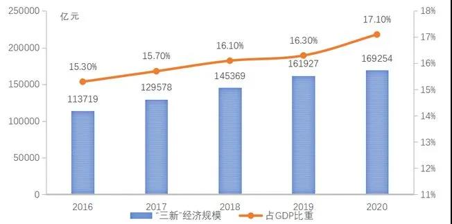 2016-2020年“三新”經(jīng)濟規(guī)模及占GDP比重