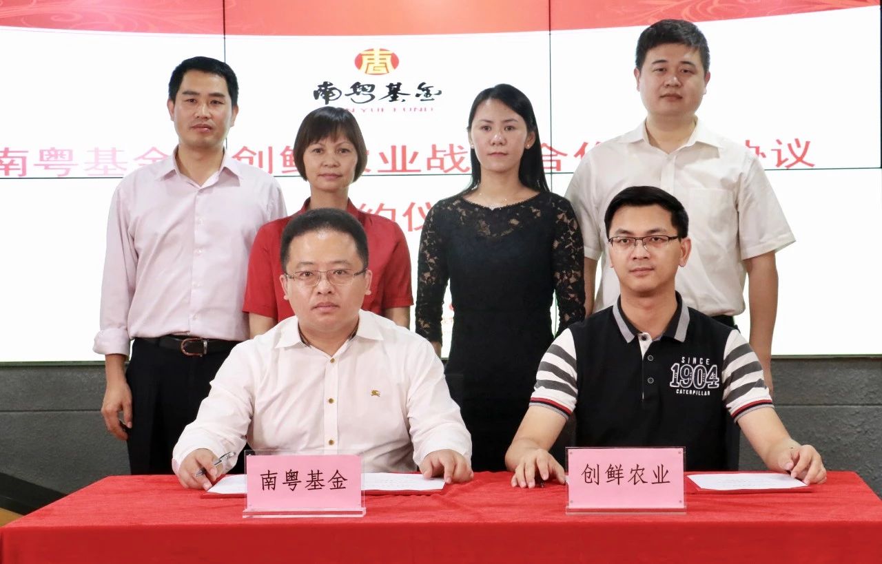 (前左:南粵基金集團(tuán)董事長(zhǎng)林濤 前右:創(chuàng)鮮農(nóng)業(yè)總經(jīng)理宋俊文 后左二:創(chuàng)鮮農(nóng)業(yè)董事吳水群 后左三:創(chuàng)鮮農(nóng)業(yè)董事長(zhǎng)劉淑芬)