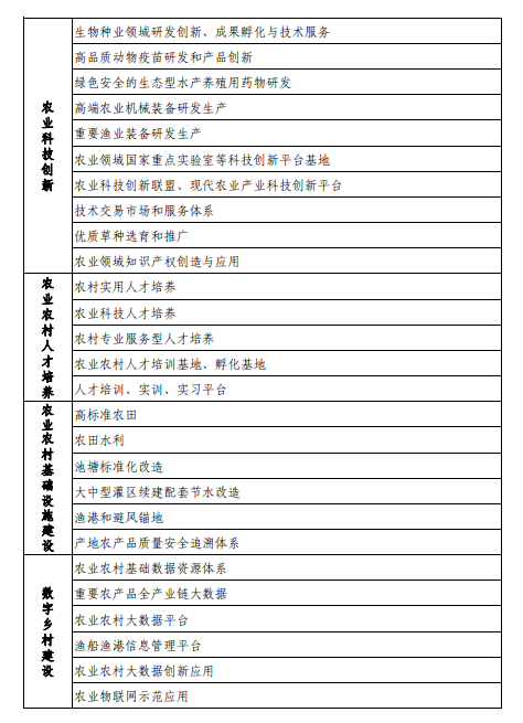 (七)農(nóng)業(yè)科技創(chuàng)新。鼓勵社會資本創(chuàng)辦農(nóng)業(yè)科技創(chuàng)新型企業(yè),參與實施農(nóng)業(yè)關(guān)鍵核心技術(shù)攻關(guān)行動,開展生物種業(yè)、重型農(nóng)機、漁業(yè)裝備、智慧農(nóng)業(yè)、綠色投入品、漁具標識和玻璃鋼等新材料漁船等領(lǐng)域的研發(fā)創(chuàng)新、成果轉(zhuǎn)化與技術(shù)服務(wù)。鼓勵社會資本牽頭建設(shè)農(nóng)業(yè)領(lǐng)域國家重點實驗室等科技創(chuàng)新平臺基地,參與農(nóng)業(yè)科技創(chuàng)新聯(lián)盟、國家現(xiàn)代農(nóng)業(yè)產(chǎn)業(yè)科技創(chuàng)新中心等建設(shè),打造產(chǎn)學(xué)研用深度融合平臺。引導(dǎo)社會資本發(fā)展技術(shù)交易市場和服務(wù)機構(gòu),提供科技成果轉(zhuǎn)化服務(wù),加快先進實用技術(shù)集成創(chuàng)新與推廣應(yīng)用。