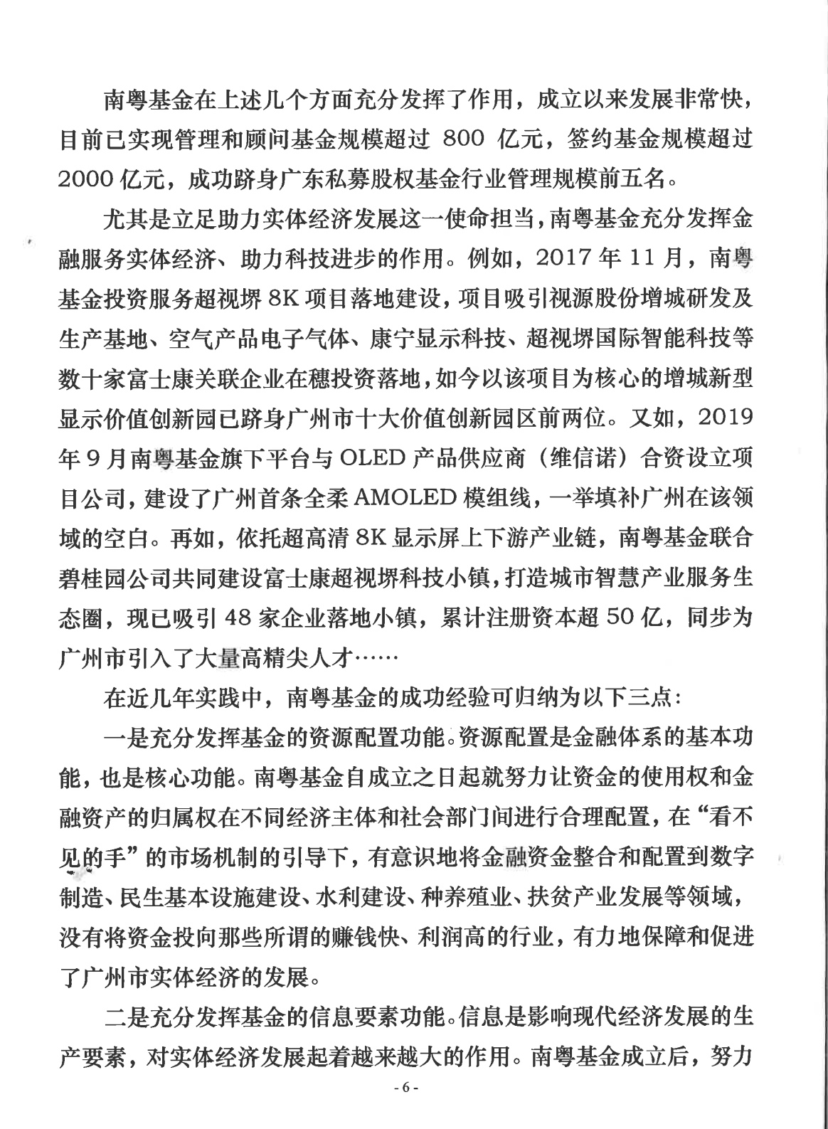 尤其是立足助力實體經(jīng)濟發(fā)展這一使命擔當,南粵基金充分發(fā)揮金融服務(wù)實體經(jīng)濟、助力科技進步的作用。例如,2017年11月,南粵基金投資服務(wù)超視堺8K項目落地建設(shè),項目吸引視源股份增城研發(fā)及生產(chǎn)基地、空氣產(chǎn)品電子氣體、康寧顯示科技、超視堺國際智能科技等數(shù)十家富士康關(guān)聯(lián)企業(yè)在穗投資落地,如今以該項目為核心的增城新型顯示價值創(chuàng)新園已躋身廣州市十大價值創(chuàng)新園區(qū)前兩位。又如,2019年9月南粵基金旗下平臺與OLED產(chǎn)品供應(yīng)商(維信諾)合資設(shè)立項目公司,建設(shè)了廣州首條全柔AMOLED模組線,一舉填補廣州在該領(lǐng)域的空白。再如,依托超高清8K顯示屏上下游產(chǎn)業(yè)鏈,南粵基金聯(lián)合碧桂園公司共同建設(shè)富士康超視堺科技小鎮(zhèn),打造城市智慧產(chǎn)業(yè)服務(wù)生態(tài)圈,現(xiàn)已吸引48家企業(yè)落地小鎮(zhèn),累計注冊資本超50億,同步為廣州市引入了大量高精尖人才......