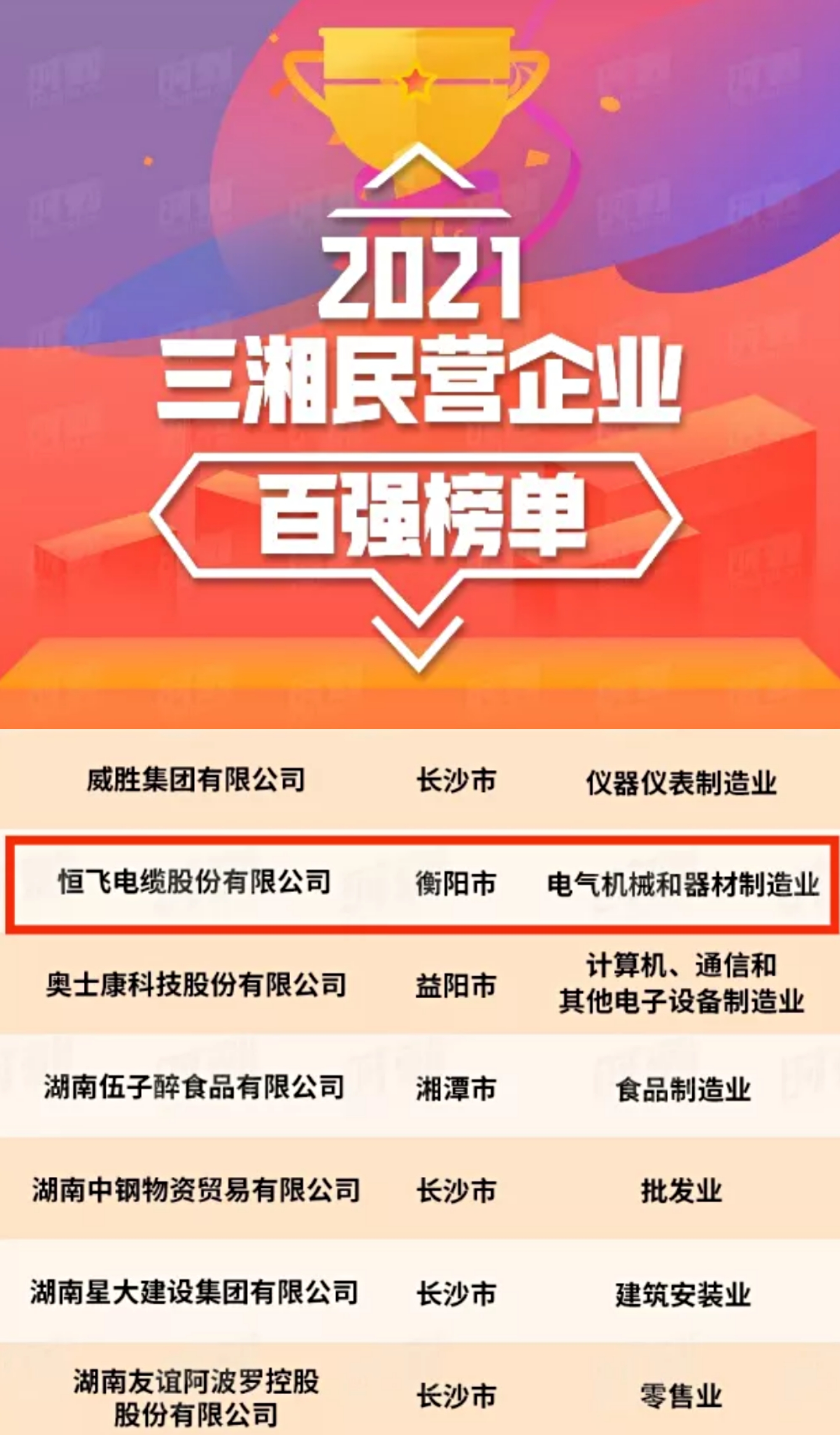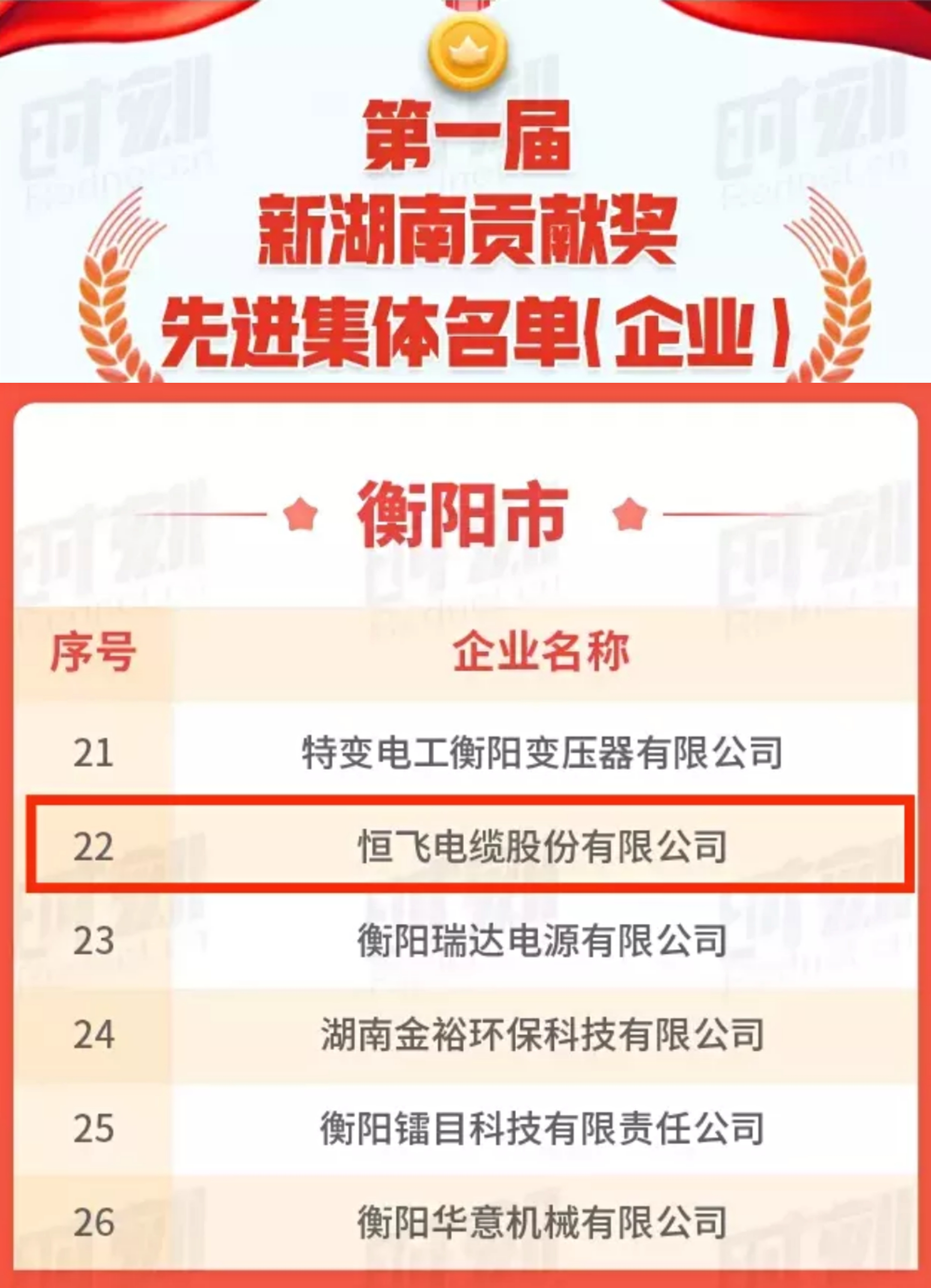 新年伊始,萬象更新。湖南省政府近日發(fā)布了《中共湖南省委湖南省人民政府關(guān)于表彰第一屆新湖南貢獻(xiàn)獎(jiǎng)先進(jìn)集體和先進(jìn)個(gè)人的決定》和2021“三湘民營企業(yè)百強(qiáng)榜”名單,其中,南粵基金投資企業(yè)恒飛電纜股份有限公司(簡(jiǎn)稱“恒飛電纜”)榮獲第一屆“新湖南貢獻(xiàn)獎(jiǎng)先進(jìn)集體”,并榮登“2021三湘民營企業(yè)百強(qiáng)榜單”。