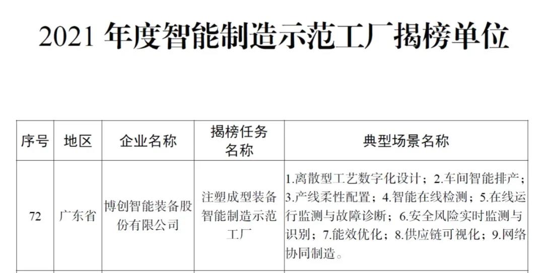 近日,國家工業(yè)和信息化部公布了2021年度智能制造試點示范工廠揭榜單位和優(yōu)秀場景名單,南粵基金投資企業(yè)——博創(chuàng)智能裝備股份有限公司(簡稱“博創(chuàng)智能”)入選智能制造試點示范工廠揭榜單位。