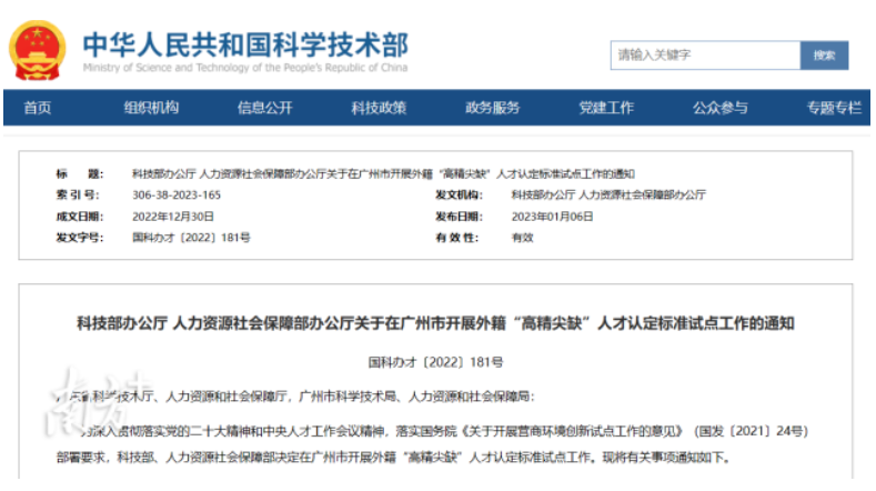 近日,科技部、人力資源社會(huì)保障部發(fā)布通知,在廣州市開(kāi)展外籍“高精尖缺”人才認(rèn)定標(biāo)準(zhǔn)試點(diǎn)工作。廣州成為全國(guó)開(kāi)展這項(xiàng)試點(diǎn)工作的首批六個(gè)城市之一。