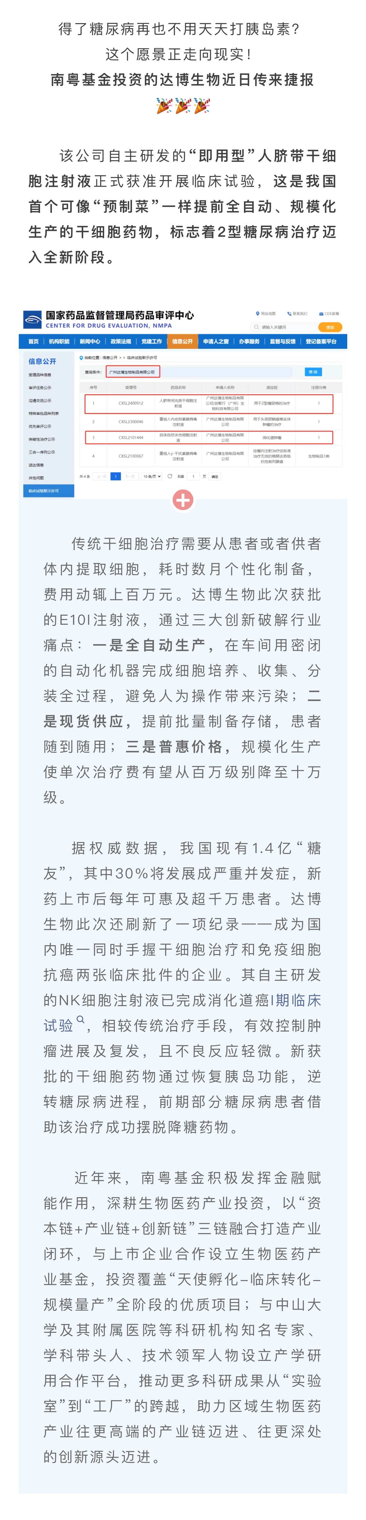 新突破!南粵基金投資項(xiàng)目——國產(chǎn)“萬能干細(xì)胞藥”進(jìn)入臨床