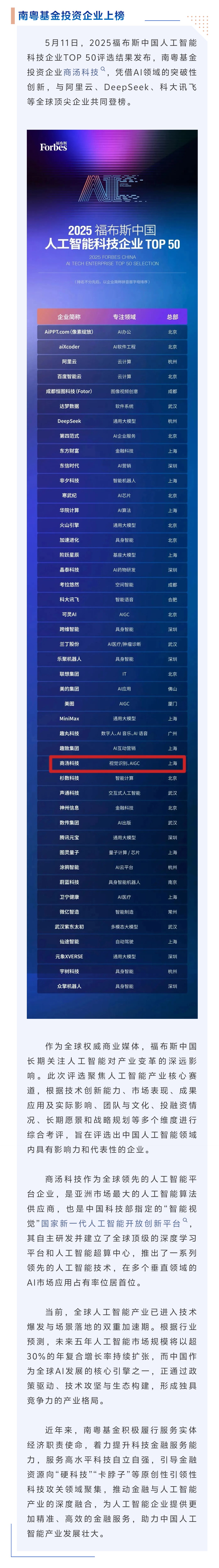 福布斯中國AI企業(yè)50強!南粵基金投資企業(yè)上榜