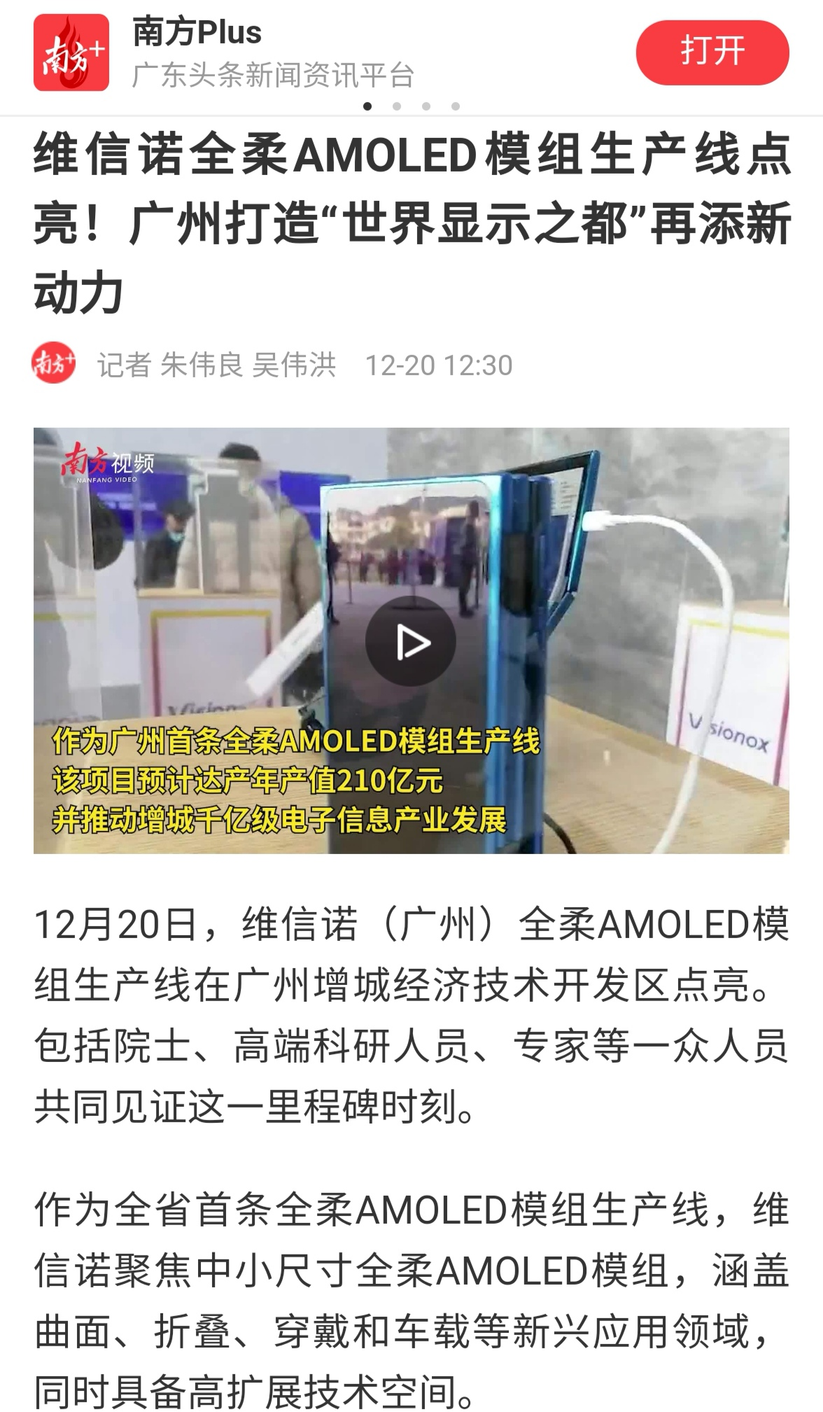 南方+|維信諾全柔AMOLED模組生產(chǎn)線點亮!廣州打造“世界顯示之都”再添新動力