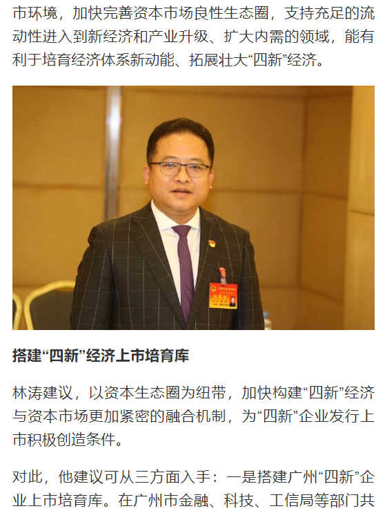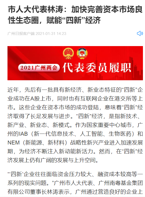 廣州日報|市人大代表林濤:?加快完善資本市場良性生態(tài)圈,賦能“四新”經(jīng)濟
