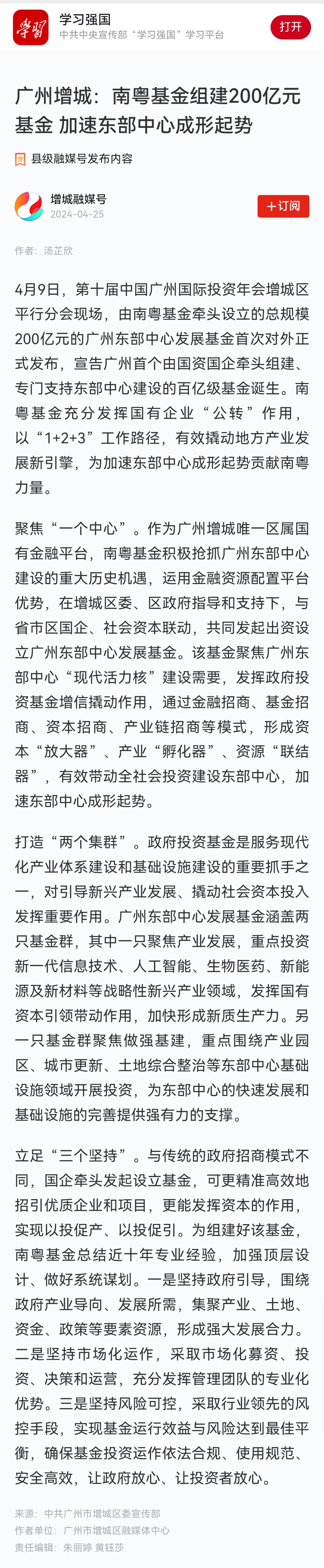 學(xué)習(xí)強(qiáng)國(guó) | 廣州增城:南粵基金組建200億元基金 加速東部中心成形起勢(shì)