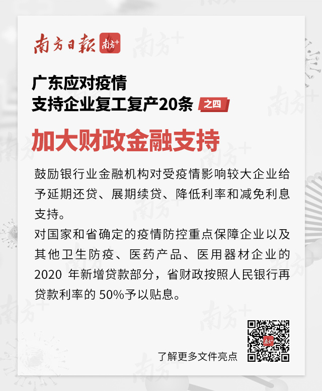 2月6日下午,廣東省政府正式印發(fā)《關于應對新型冠狀病毒感染的肺炎疫情支持企業(yè)復工復產的若干政策措施》,從進一步加大保障企業(yè)復工復產工作力度、降低企業(yè)用工成本、減輕企業(yè)經營負擔、加大財政金融支持、優(yōu)化政府服務等關鍵環(huán)節(jié),提出了5方面共20項政策措施,全力支持和推動受疫情影響的各類企業(yè)復工復產。五圖輕松讀懂>>>