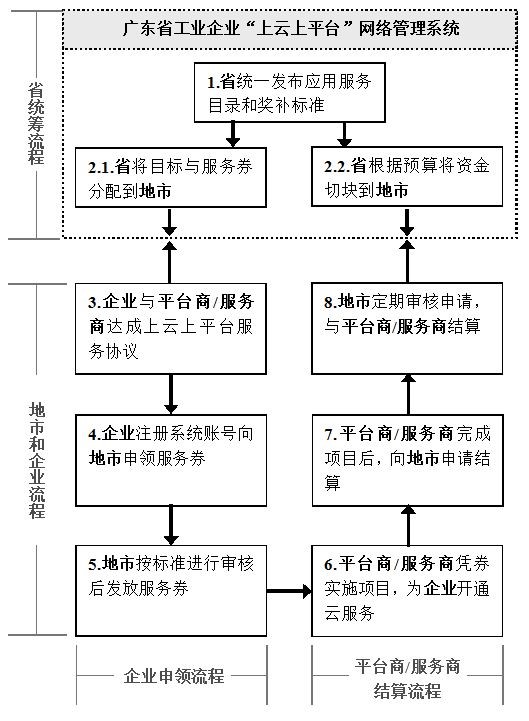 方式:財(cái)政資金支持。省財(cái)政采取服務(wù)券后補(bǔ)助方式,對工業(yè)企業(yè)“上云上平臺”費(fèi)用按標(biāo)準(zhǔn)予以獎補(bǔ)(納入獎補(bǔ)的應(yīng)用服務(wù)目錄和獎補(bǔ)標(biāo)準(zhǔn)由省統(tǒng)一制定發(fā)布并按年度更新)。建設(shè)廣東省工業(yè)企業(yè)“上云上平臺”網(wǎng)絡(luò)管理系統(tǒng),統(tǒng)籌監(jiān)督管理服務(wù)券發(fā)放和資金結(jié)算。服務(wù)券獎補(bǔ)范圍包括應(yīng)用服務(wù)費(fèi)、設(shè)備接入費(fèi)、網(wǎng)絡(luò)改造費(fèi)等,不包括企業(yè)購買自動化、智能化設(shè)備等費(fèi)用。(省經(jīng)濟(jì)和信息化委、財(cái)政廳,各地級以上市人民政府)